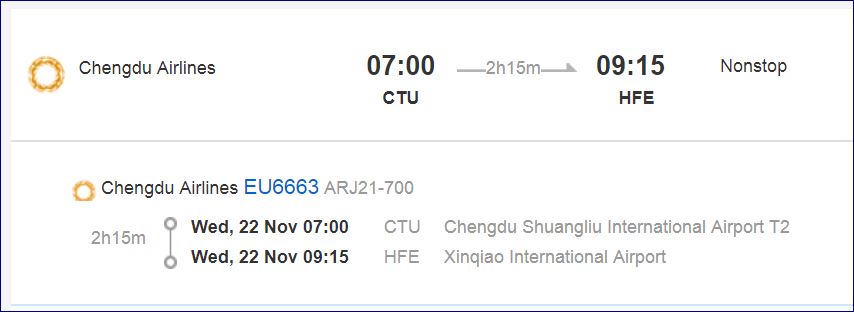 I checked daily. Or more than daily, in many cases. Eventually the flights appeared. Since I was traveling on a Wednesday I would be flying to Xinqiao International Airport in Hefei, a city I’d never heard of that happens to have nearly 8 million residents. On some days the ARJ21 flies to Changsha Huanghua International Airport (CSX); occasionally it continues from there to Shanghai. Or nonstop to Shanghai. And all of that might change on a whim. Good luck.